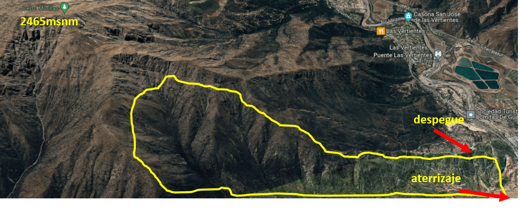 El área de vuelo consiste en el área delimitada en fotograma, faldeos lado sur-oriente de cerro Minillas hacia el valle, y por el sur camino El Volcán .